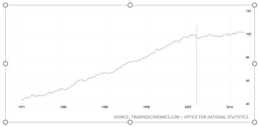 UK Labour Productivity (indexed for historical comparison; red line indicates GFC)