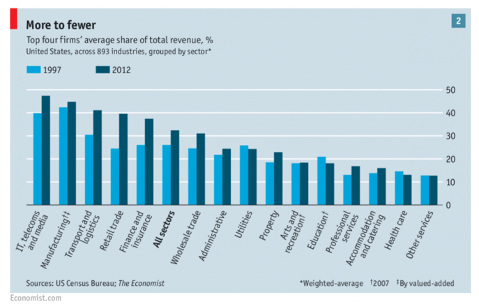 For example, an Economist analysis found that “between 1997 and 2012 the weighted-average share of the revenues of the top four firms within each industry revenues rose from 26% to 32% of the total.”[5]