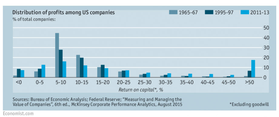 The Economist also found that profits had become increasingly concentrated at the upper end of the distribution, indicating a greater market share for the most successful companies.