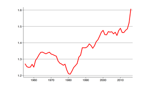 However, when competition is weaker, the incentive to lower prices at the expense of mark-ups is reduced. This means that industries in which market concentration is growing (likely resulting in reduced competition) are expected to witness increasing mark-ups. Consistent with the hypothesis of increasing market share in advanced economies, evidence does indeed indicate that the weighted average of mark-ups charged by companies has increased considerably since around 1980. For example, the following data is from De Loecker et al.’s (2018) analysis of US mark-ups based on firm-level data from the US census as well as the Computstat database.