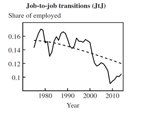 Clue 2 related to trends in labour market fluidity, particularly the fact that job-to-job transfers decreased suddenly around the year 2000 (roughly when interest rates started falling to a hitherto record low), stopped decreasing in the mid-2000s (as interest rates rose again) and then dropped suddenly again around the time of the mega-cuts in interest rates that occurred around 2008 due to the GFC.