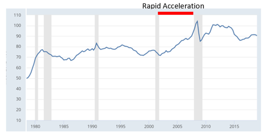 Low interest rates in the US resulted in less severe market discipline in the area of credit allocation. In a high interest rate environment, poorly performing firms are either forced to exit the market or, in cases of less extreme underperformance, accept reduced market share. However, in an environment in which credit is cheap and widely available, such as a low interest rate environment, weak firms can reduce losses to their market share and delay the onset of bankruptcy by borrowing cheaply to continue operating. With low interest rates, even firms making very small profits are likely to be able to cover their interest payments, and even those that don’t can forestall the onset of bankruptcy by continually refinancing outstanding debt – hence the historically low bankruptcy rates observed in the current economic recovery: