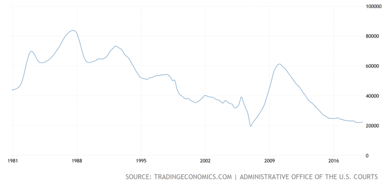 This drop in interest rates caused a rise in zombie companies – we see a steady decline in bankruptcy numbers in the United States over the past decade (figure 24), indicating that many more companies were being kept alive by low interest rates. Due to the mechanisms described above, this led to a continued increase in productivity dispersion: more zombie companies bring down the productivity of the lower end of the productivity distribution more than the upper end. Indeed, evidence indicates that the productivity of the upper 5% of the productivity distribution of firms has continued to grow at the same pace for the pre- and post- GFC periods in the US[21], meaning that the overall productivity slowdown is likely due to the growing prevalence of zombies in the remaining 95% of the distribution.