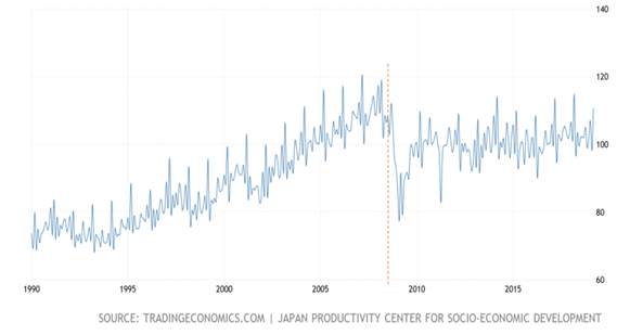 Japan Labour productivity (indexed for historical comparison; red line indicates GFC):