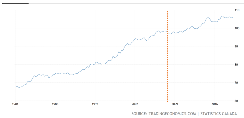 Canada Labour Productivity (indexed for historical comparison; red line indicates GFC)