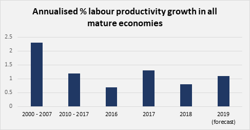 Across the world, labour productivity – output per hour worked – has been growing at a historically low rate for about a decade. This slowdown has been particularly pronounced in advanced economies, as seen in the figures below.